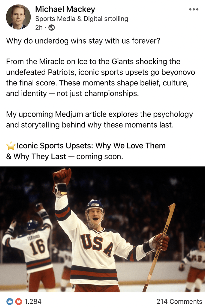 Great stories don’t begin when the article goes live — they begin when curiosity is sparked. To build anticipation for my upcoming Medium feature, “Iconic Sports Upsets: Why We Love Them & Why They Last,” I created a series of short-form promotional teasers tailored to three major social platforms: LinkedIn, Instagram/Facebook, and X (Twitter).